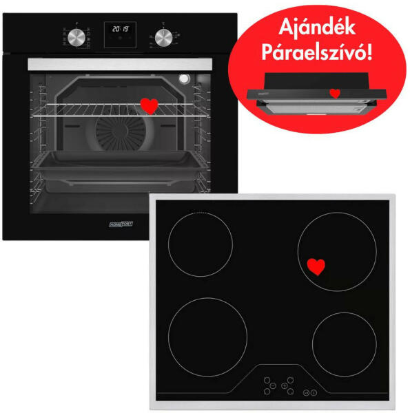 HOMEFORT HSB64DGB Beépíthető fekete sütő + HOMEFORT HFBK64T2B kerámia főzőlap + ajándék HPK611B Beépíthető fekete kihúzható elszívó (HSB64DGB)
